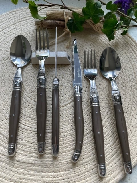 この商品は、ナイフ、フォーク、スプーン各2本、計6本のセットとなっています。持ち手は快適で、長時間の使用でも手にフィットします。刃の部分は、1.5mmのステンレス製で、耐久性と美しさを兼ね備えています。Laguioleブランドの特徴である、ナイフの電気溶接された蜜蜂のマークも魅力的です。