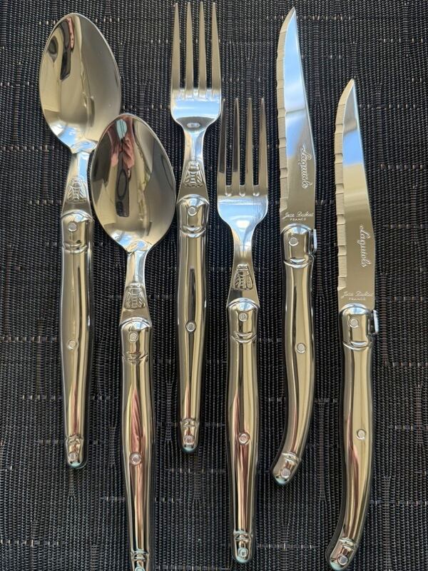 この商品は、ナイフ、フォーク、スプーン各2本、計6本のセットとなっています。持ち手は快適で、長時間の使用でも手にフィットします。刃の部分は、1.5mmのステンレス製で、耐久性と美しさを兼ね備えています。Laguioleブランドの特徴である、ナイフの電気溶接された蜜蜂のマークも魅力的です。